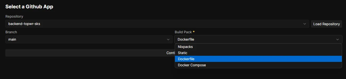 Wybieramy jak Coolify ma tworzyć obraz kontenera (zawsze Dockerfile przy Adonisie)