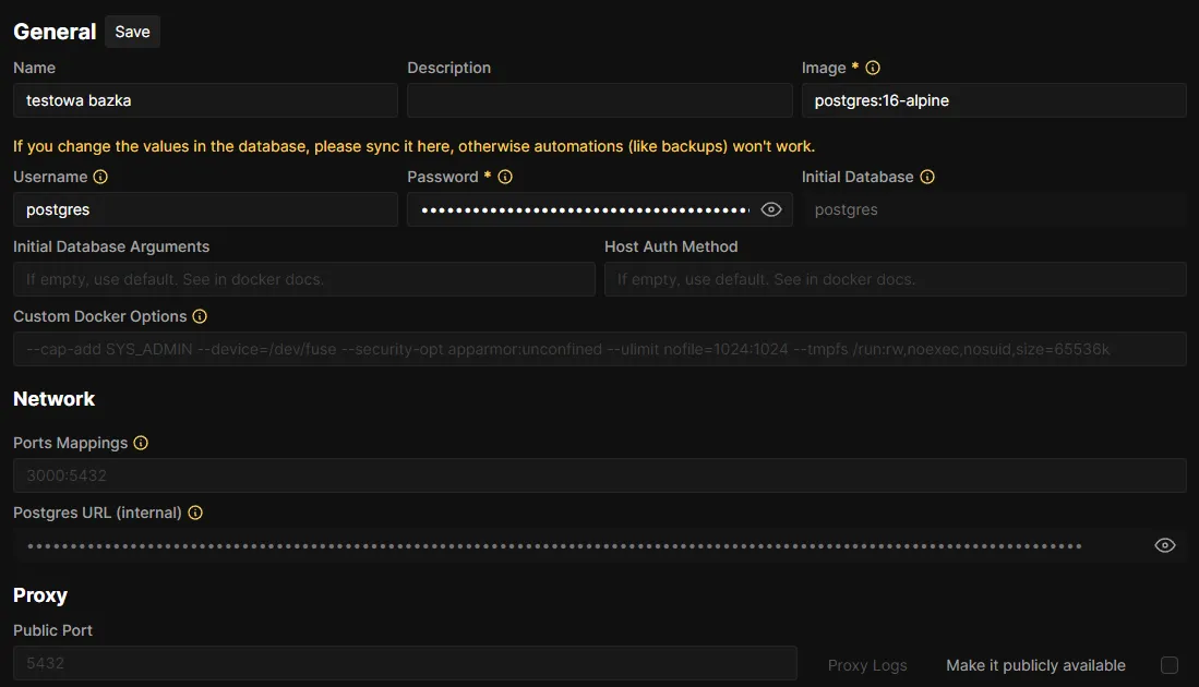 W naszym przypadku używamy Postgresql, tu nie ma większej filozofii, wystarczy się przeklikać i Coolify wszystko za nas ogarnie.