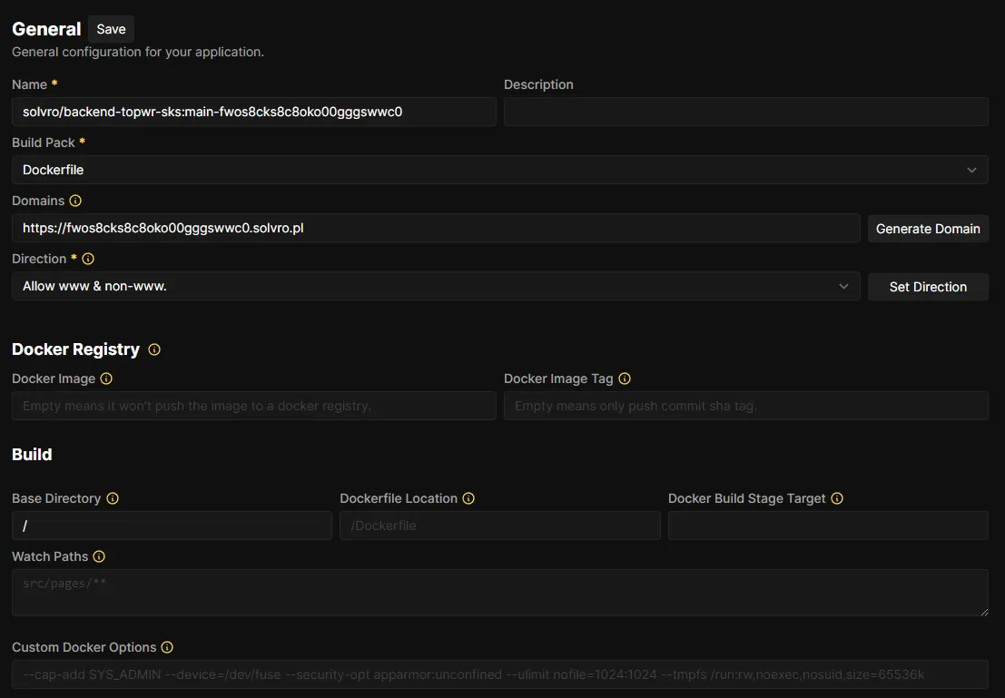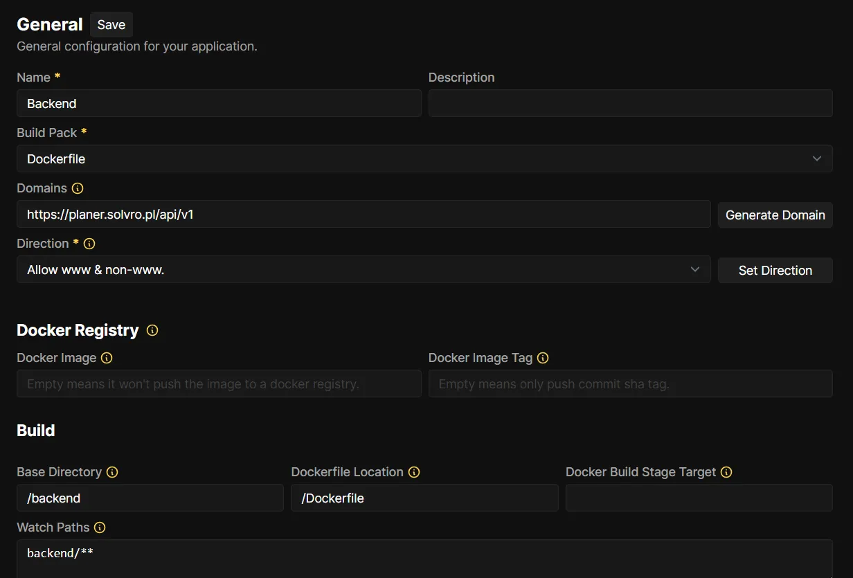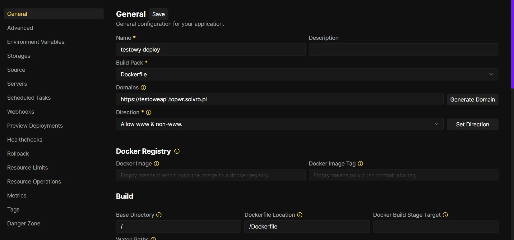 Dockerfile najlepiej umieścić w rootcie projektu o nazwie Dockerfile (tak domyślnie Coolify szuka dockerfile’a). Pamiętajcie, żeby pushnąć dockerfile’a do repo na GitHubie.