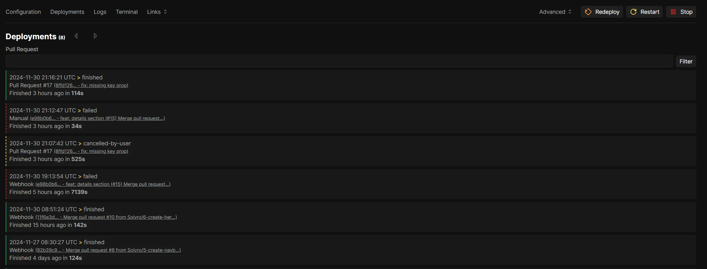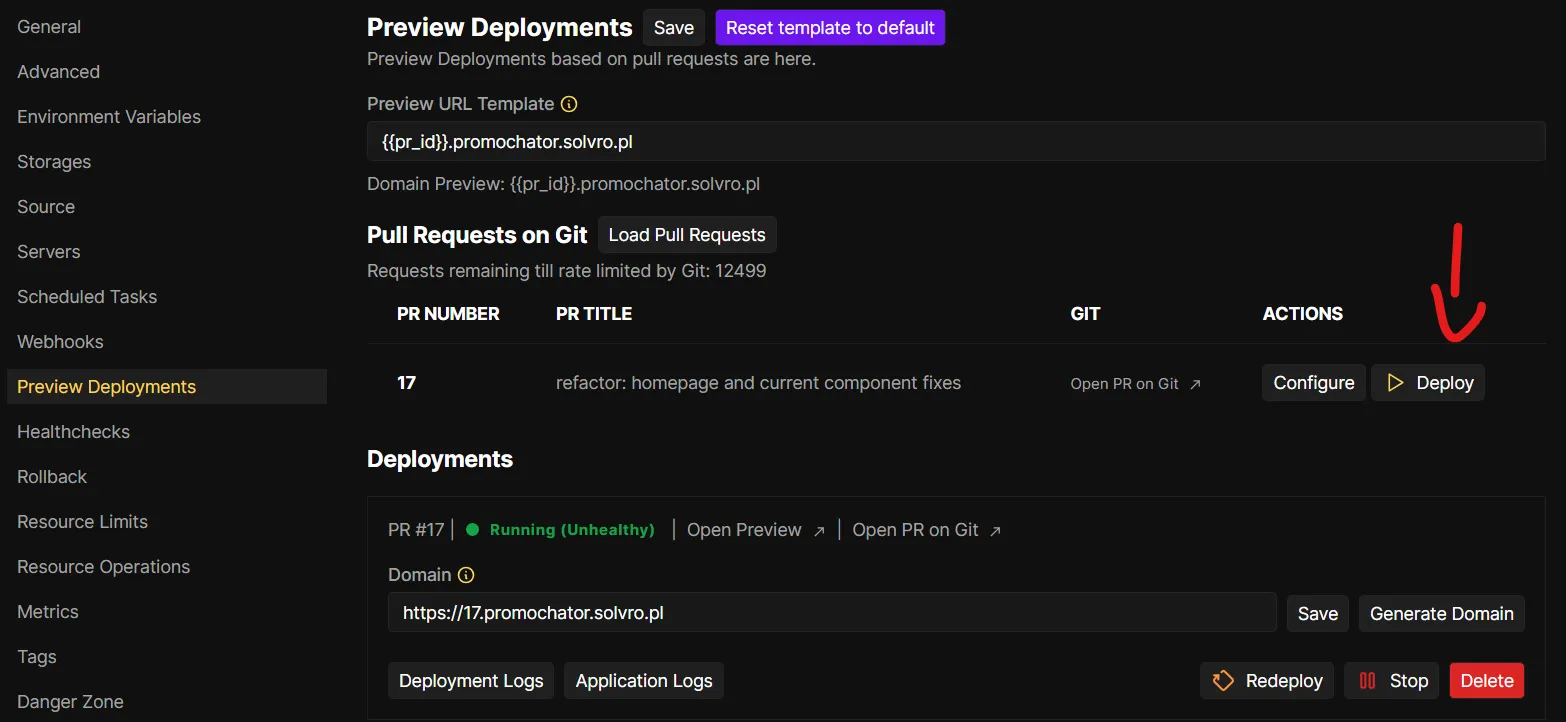Zdarzyć się może, że w trakcie deploy-u co się wykrzaczy - na ratunek przychodzi zakładka Deployments, w której możecie sprawdzić logi wszystkich deploy-ów i naprawić usterkę.