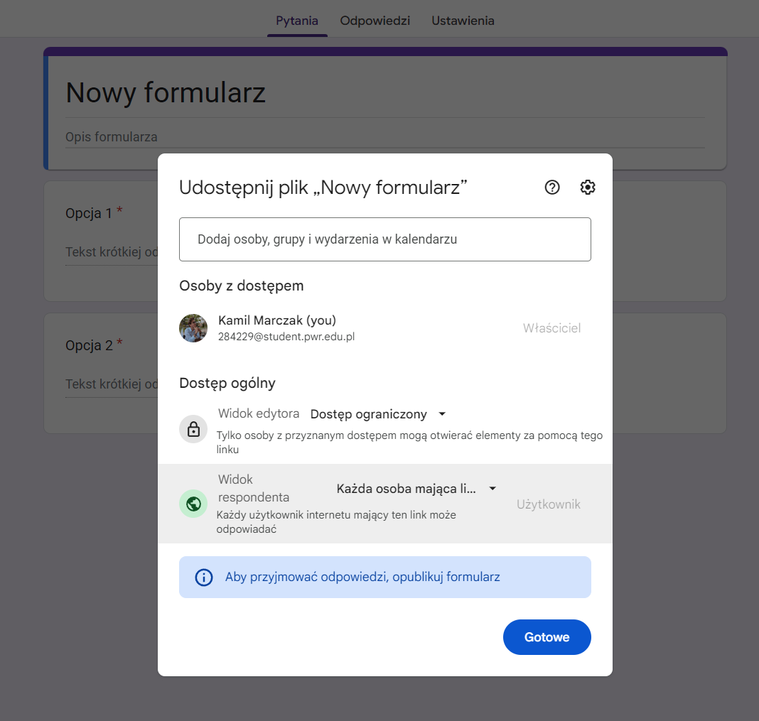 - ‘Dostęp ogólny -> Widok respondenta’ zmień z “Politechnika Wrocławska” na “Każda osoba mająca link”