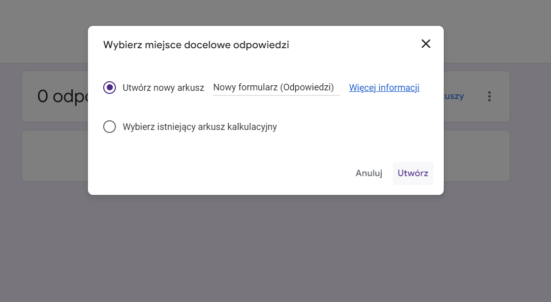 klikniesz zielony przycisk “Link do Arkuszy” -> “Utwórz”: