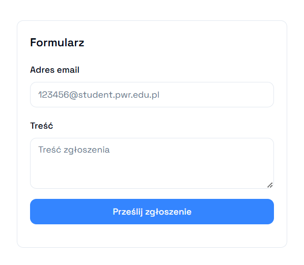 FeedbackForm.tsx "use client";import { zodResolver } from "@hookform/resolvers/zod";import React from "react";import { useForm } from "react-hook-form";import type { z } from "zod";import { Button } from "@/components/ui/button";import {Form,FormControl,FormField,FormItem,FormLabel,FormMessage,} from "@/components/ui/form";import { Input } from "@/components/ui/input";import { Textarea } from "@/components/ui/textarea";import { FeedbackFormSchema } from "@/types/schemas";export function FeedbackForm() {const form = useForm<z.infer<typeof FeedbackFormSchema>>({resolver: zodResolver(FeedbackFormSchema),defaultValues: {email: "",content: "",},});async function onSubmit(values: z.infer<typeof FeedbackFormSchema>) {// Do something with the form values}return (<div className="m-10 w-full rounded-md border p-5 sm:max-w-[425px]"><h1 className="text-lg font-semibold">Formularz</h1><Form {...form}><formonSubmit={form.handleSubmit(onSubmit)}className="grid w-full gap-4 py-4 sm:max-w-[425px]"><FormFieldcontrol={form.control}name="email"render={({ field }) => (<FormItem><FormLabel>Adres email</FormLabel><FormControl><Inputplaceholder="123456@student.pwr.edu.pl"{...field}/></FormControl><FormMessage /></FormItem>)}/><FormFieldcontrol={form.control}name="content"render={({ field }) => (<FormItem><FormLabel>Treść</FormLabel><FormControl><Textarea placeholder="Treść zgłoszenia" {...field} /></FormControl><FormMessage /></FormItem>)}/><Button type="submit">Prześlij zgłoszenie</Button></form></Form></div>);}Efekt tego wygląda mniej więcej tak: